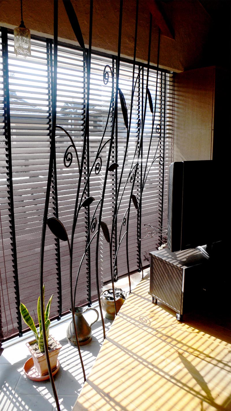 "また動き出しそうな" 膨らんだ鉄細工のスクリーンは、残された土間と新しい空間とをやわらかく仕切っている。