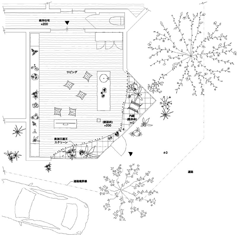 奥の既存住宅から "こぼれて広がってきた" 新設床の終端部は