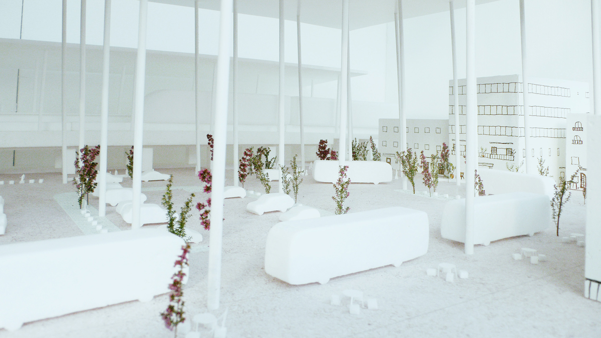 植物の育つ外のような屋根の下。