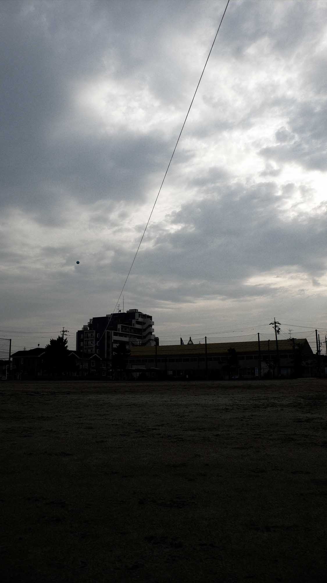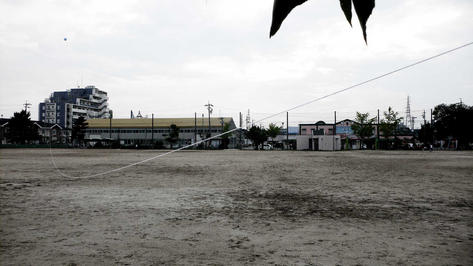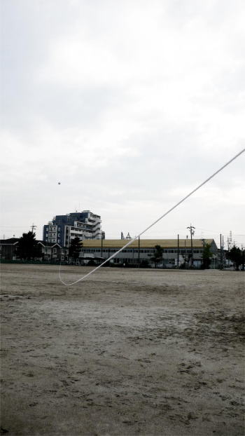 "ゆれる"installation 一本の軽く長い紐を空中に浮かせる。 あまりに長いため、風船が風に受ける揺れが紐に伝わっているというよりも 紐自体がそれぞれの区間の風に影響されて各々の場所で不均一な揺れを起こす。 一本に繋がっていながら泳ぐように自由にゆれている3次元曲線は 風船に縛られていることを忘れさせるような無重力感をつくりだす。