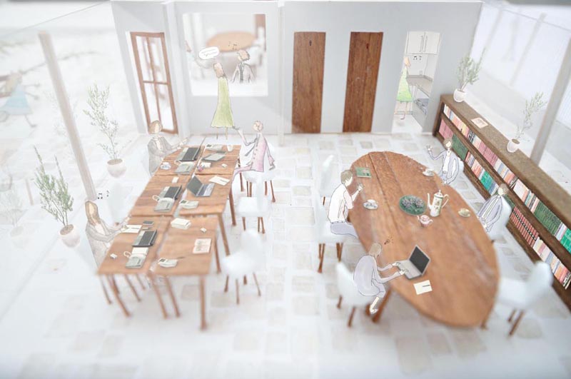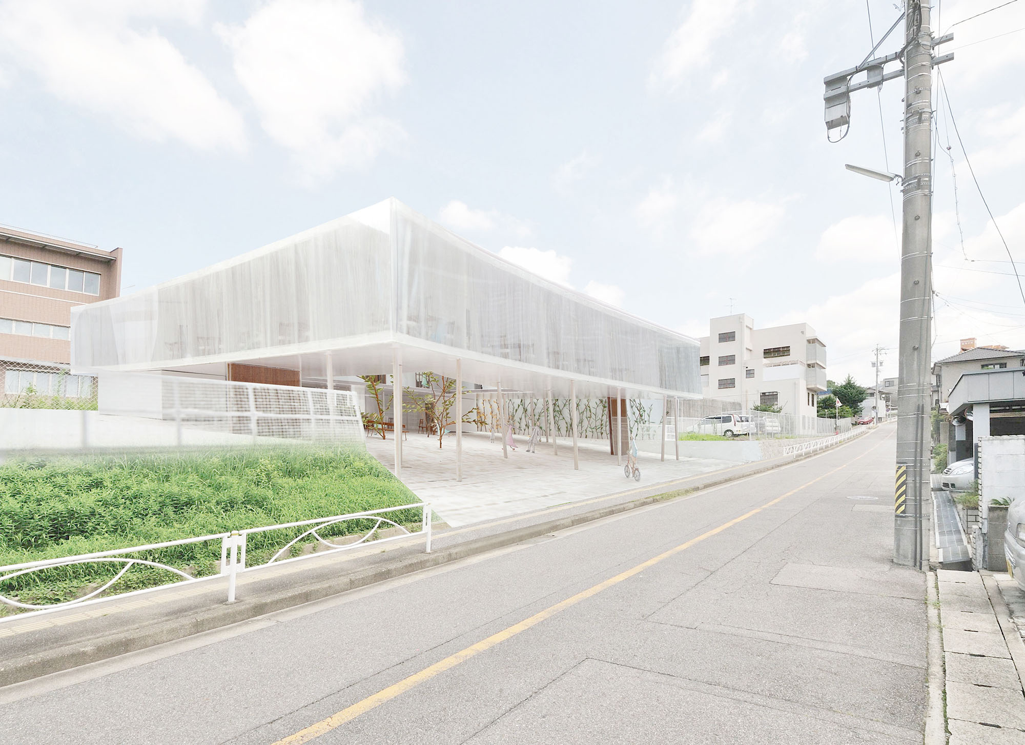 建築を2階建てとして道路側の住宅地と高さを合わせることで、周辺環境に配慮した親しみのある建物にした。