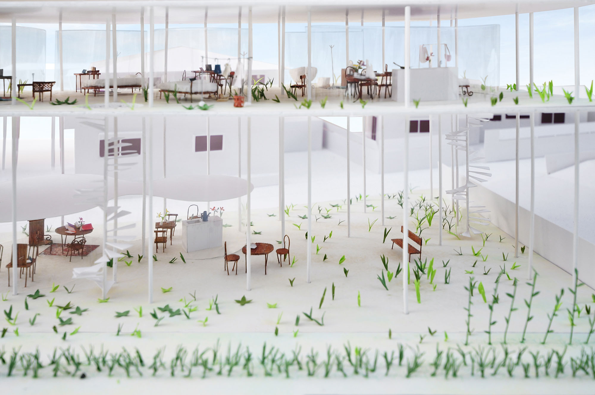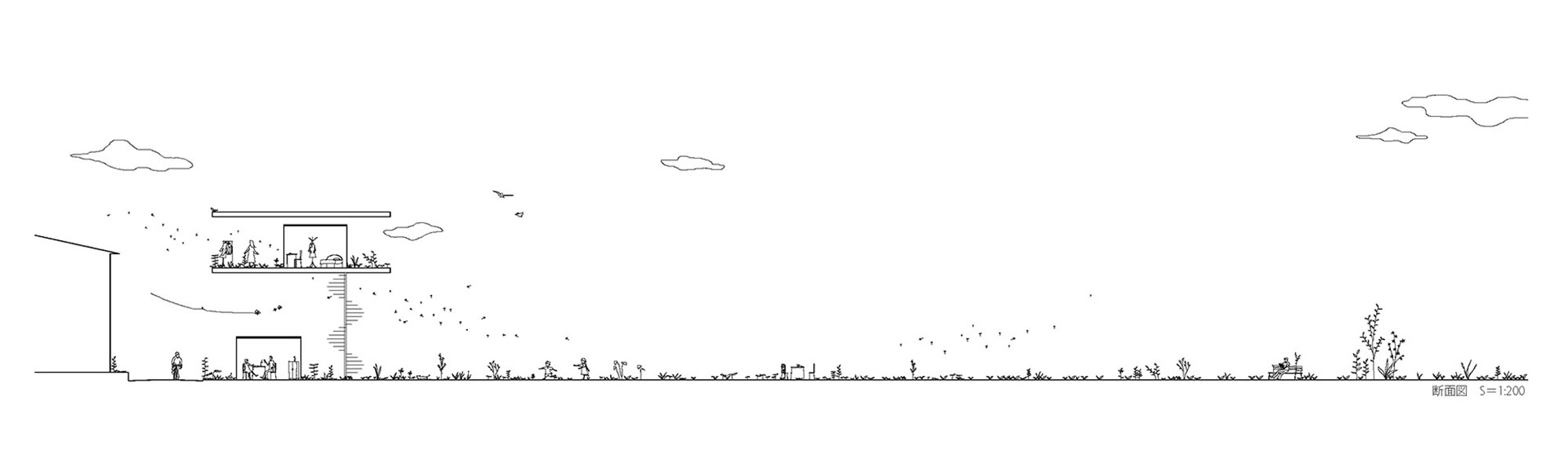 宙に浮いた2階スラブは屋根スラブとの間にできた平べったい空間と草原のような外部空間にすることで