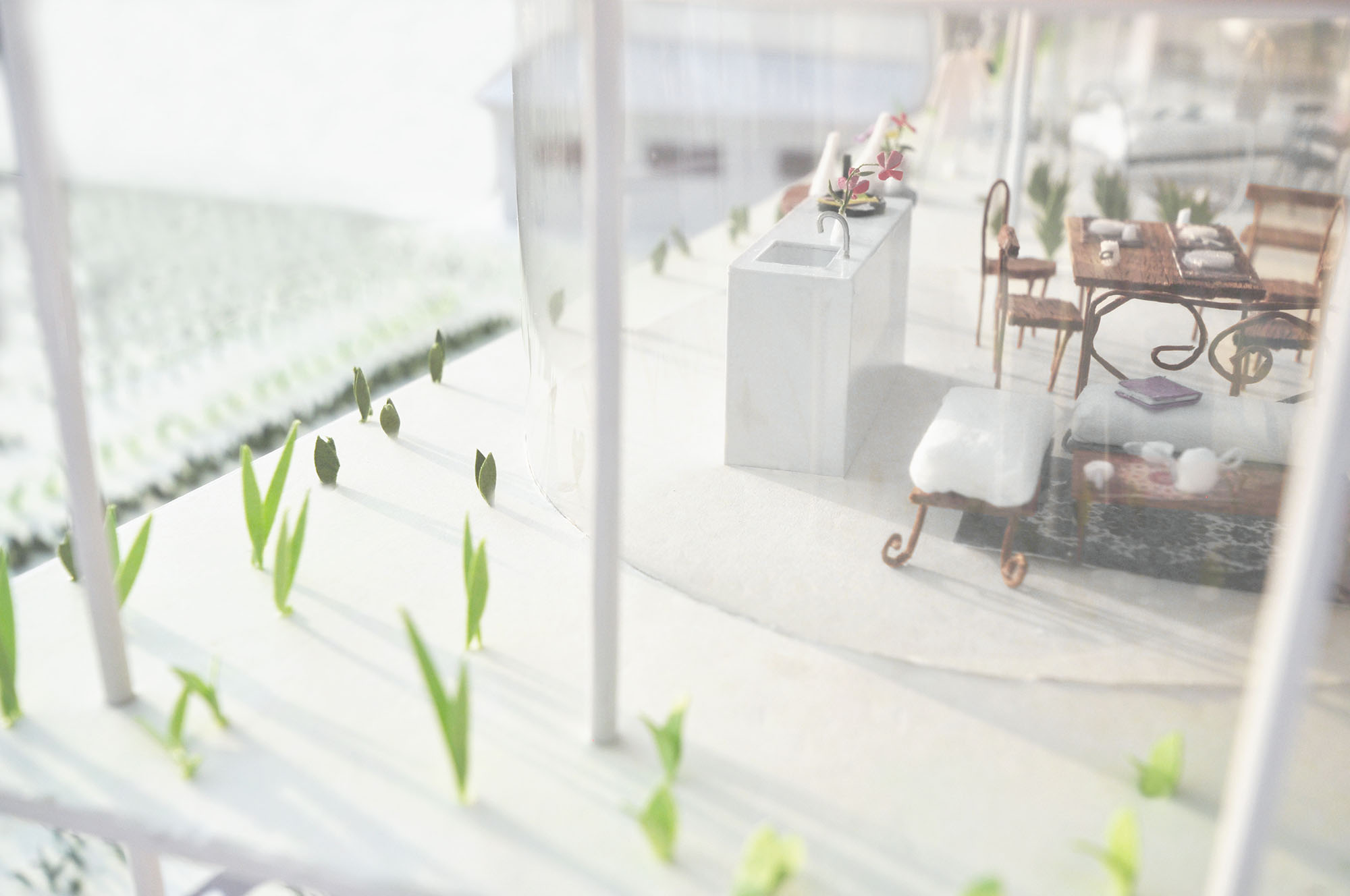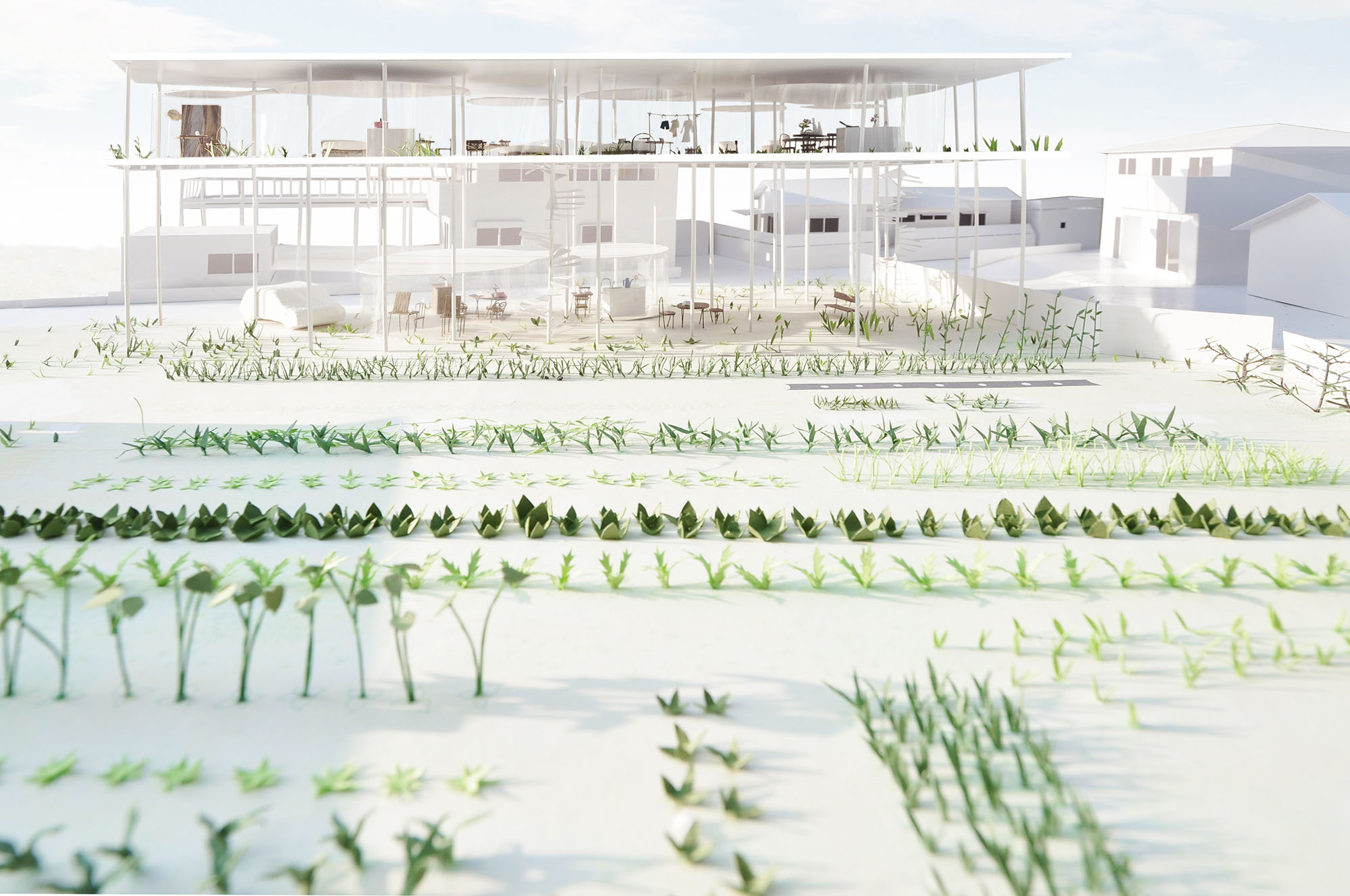 隣に水平に広がる大きな畑のある敷地に建つ住宅の計画。