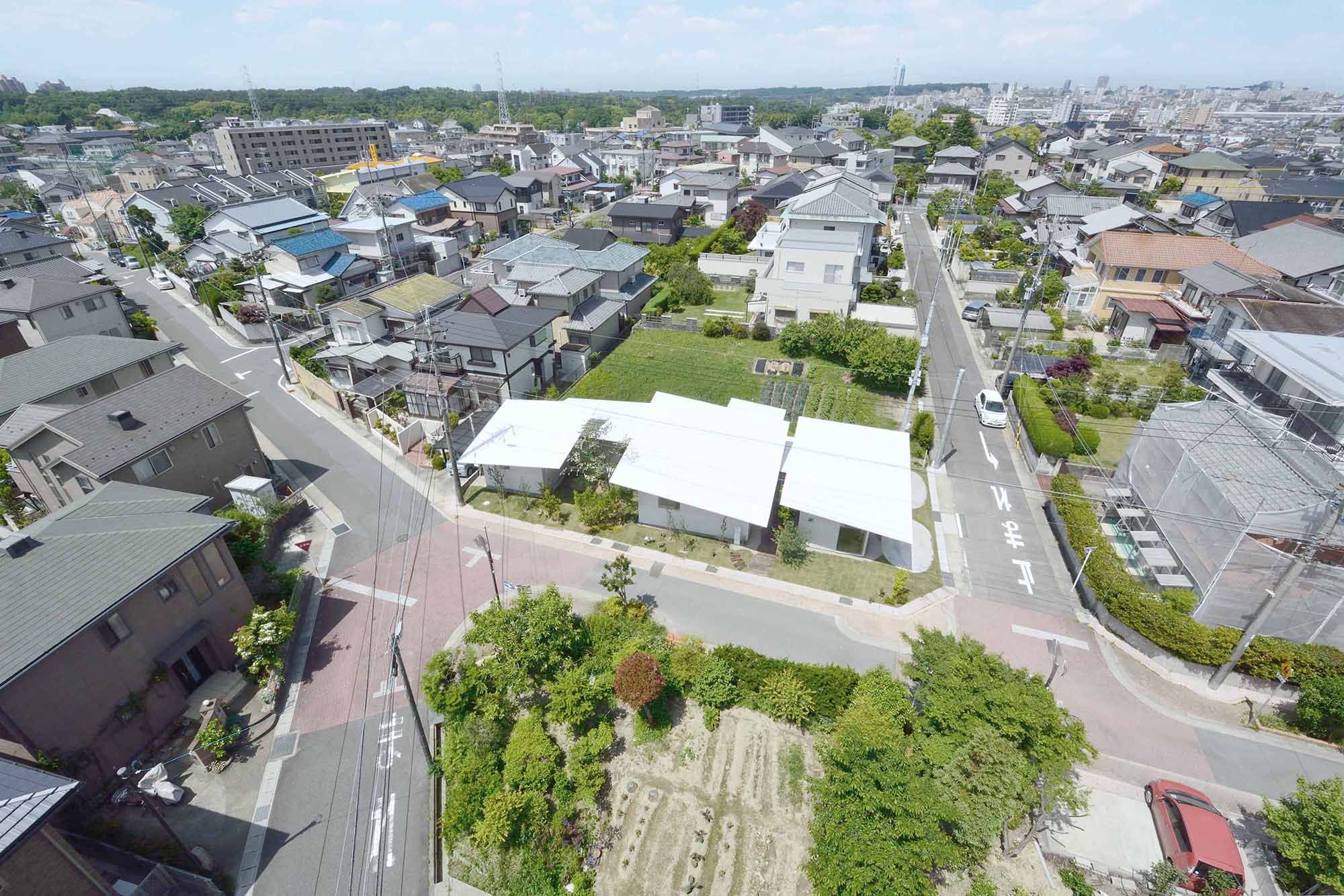 勾配を持つ街路や盛土された隣の畑などの複数の地盤面に応答してそれらをつなぎ合わせるこの土地が