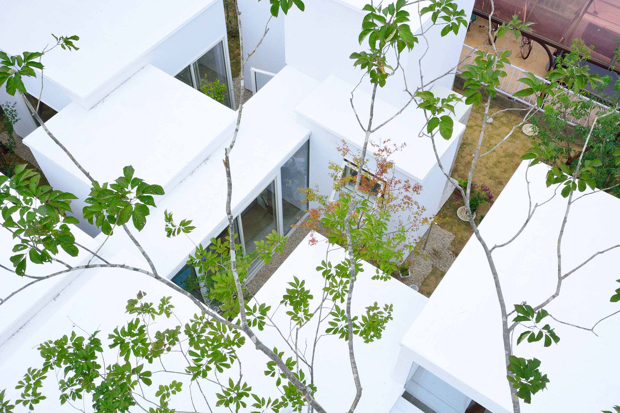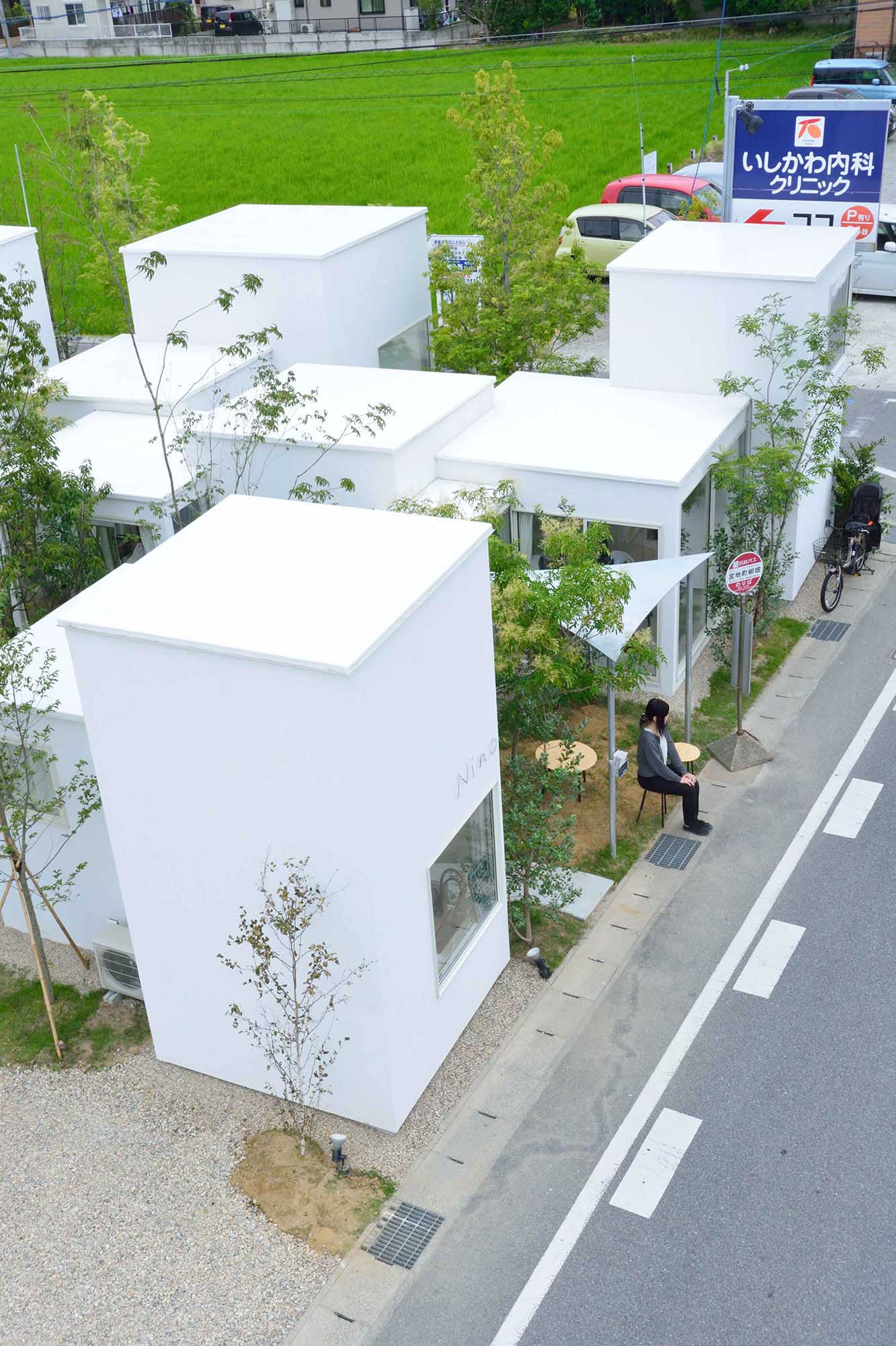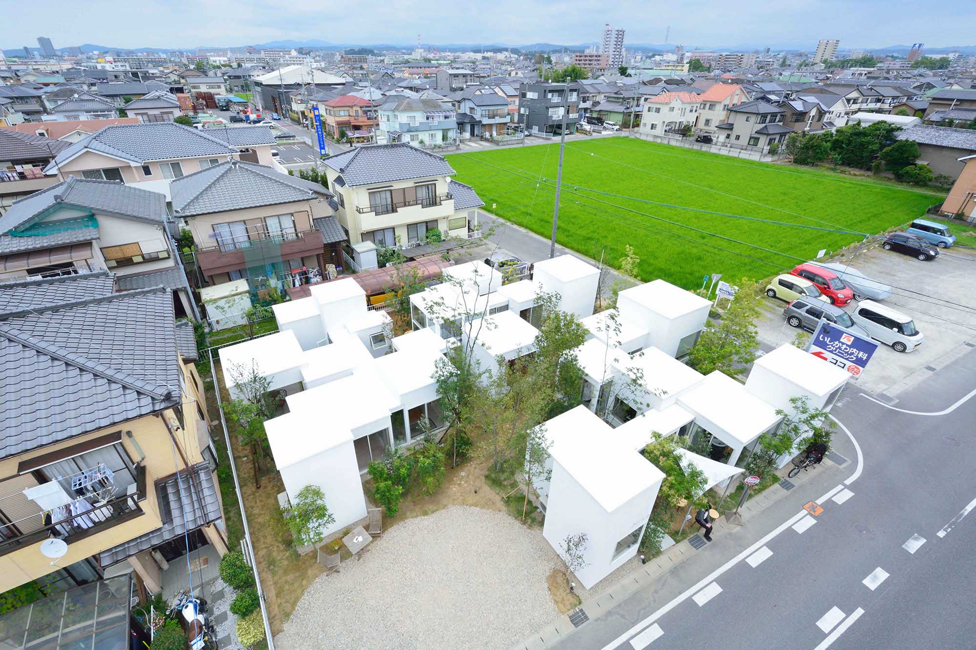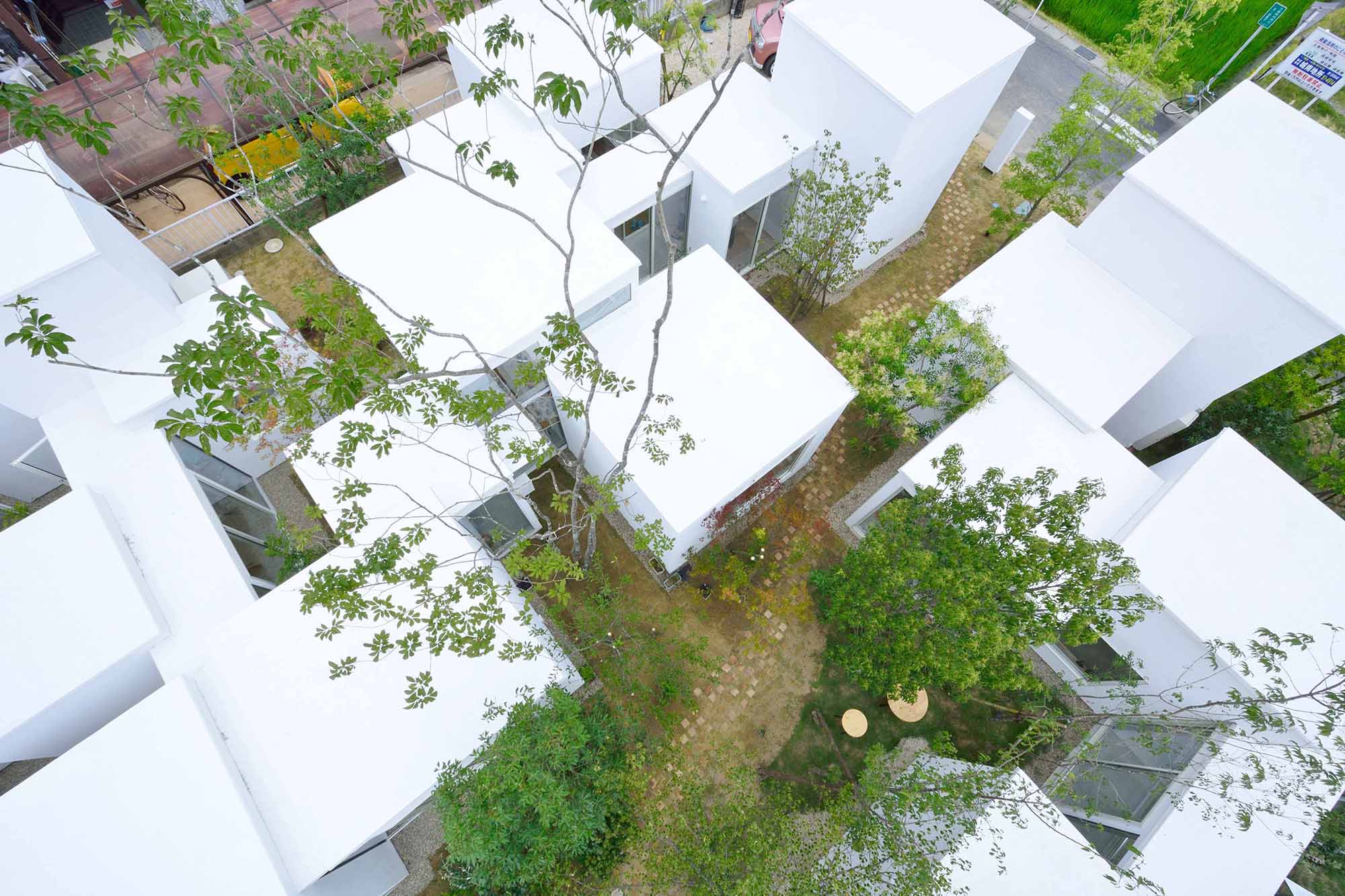 外部空間と内部が同じようなスケール・密度感で反復するような2~4畳半の小さな26の棟の連なりとし、