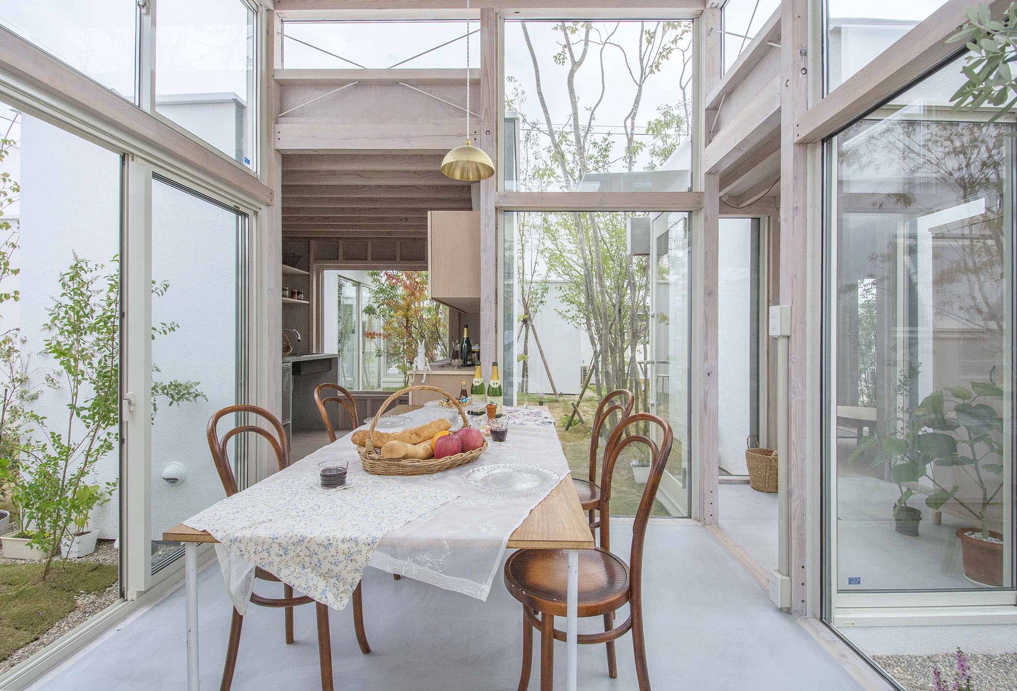 周囲の2〜3重に建て込む旗竿敷地への圧迫感を低減しながら干渉帯となるような外部を多く作った。