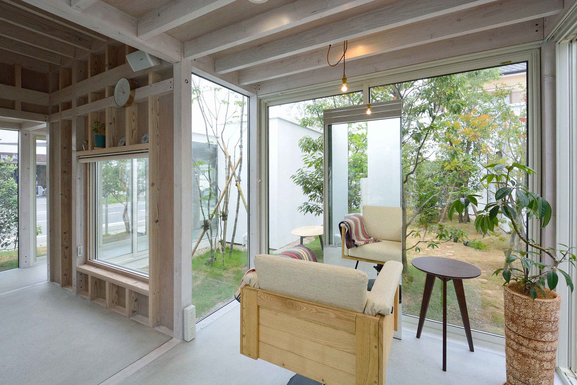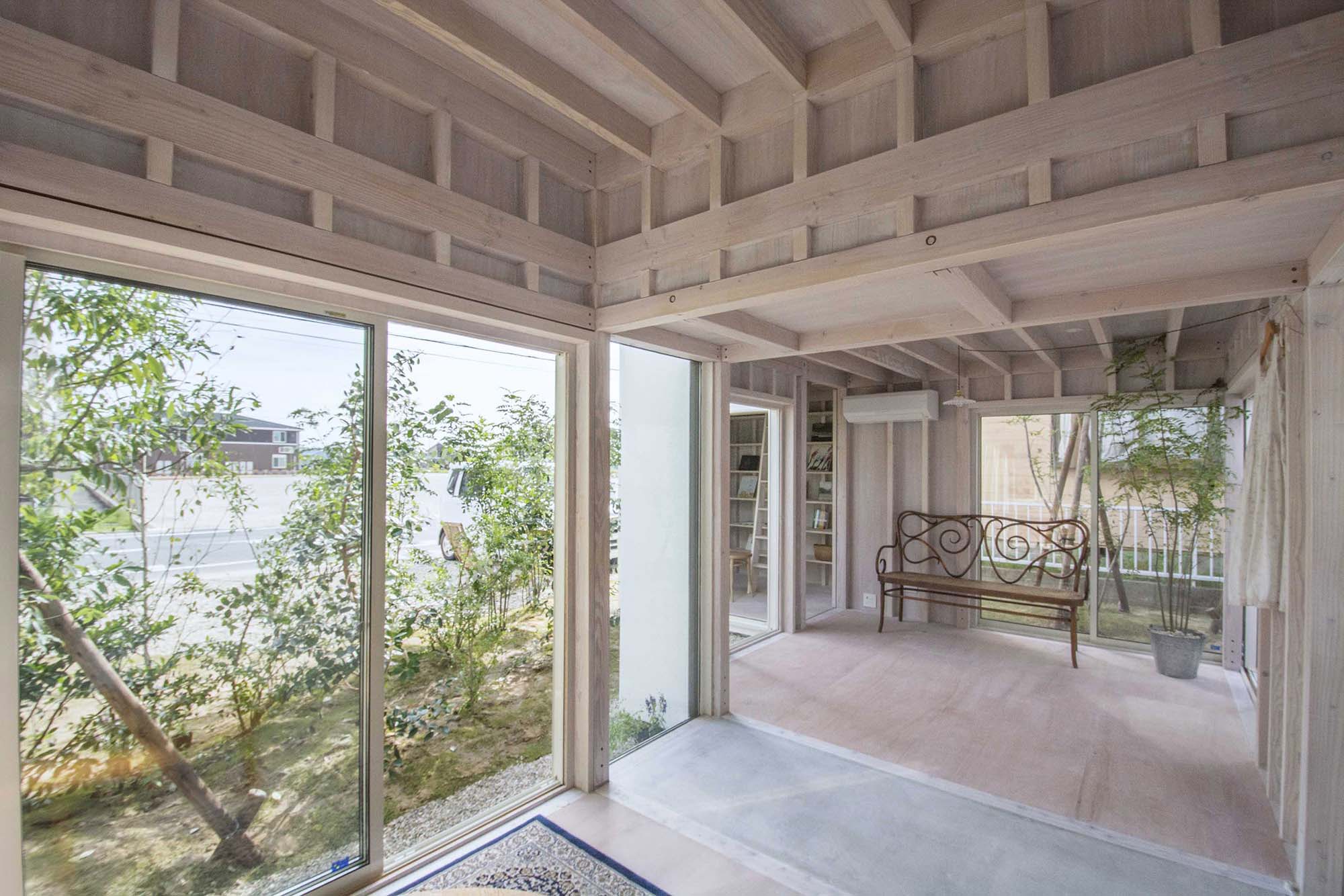 構造は、在来軸組み工法で全ての四隅柱を90角とし小さな空間スケールに対応したメンバーにした。