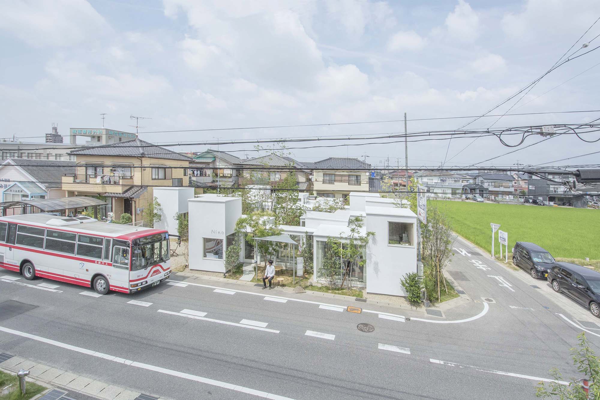 個人が営む美容院とその家族の住宅で、さらにバス停を取り込み、通り抜け散歩道を設える計画。