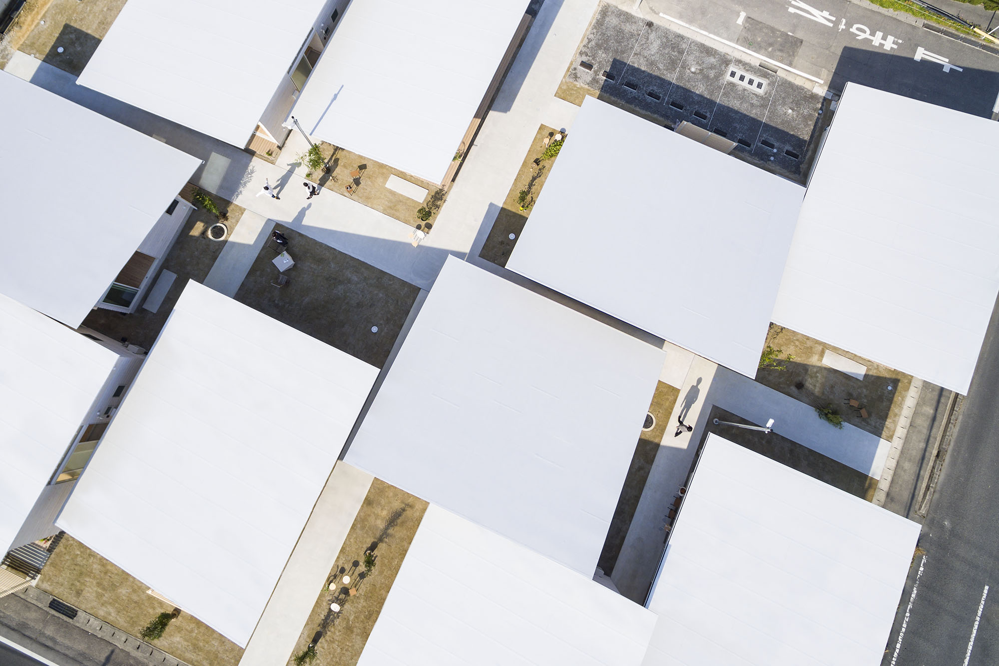 敷地内を抜ける路地には各々の棟の大きな軒が掛かり、プライベートな領域とパブリックな領域をあいまいにしている。